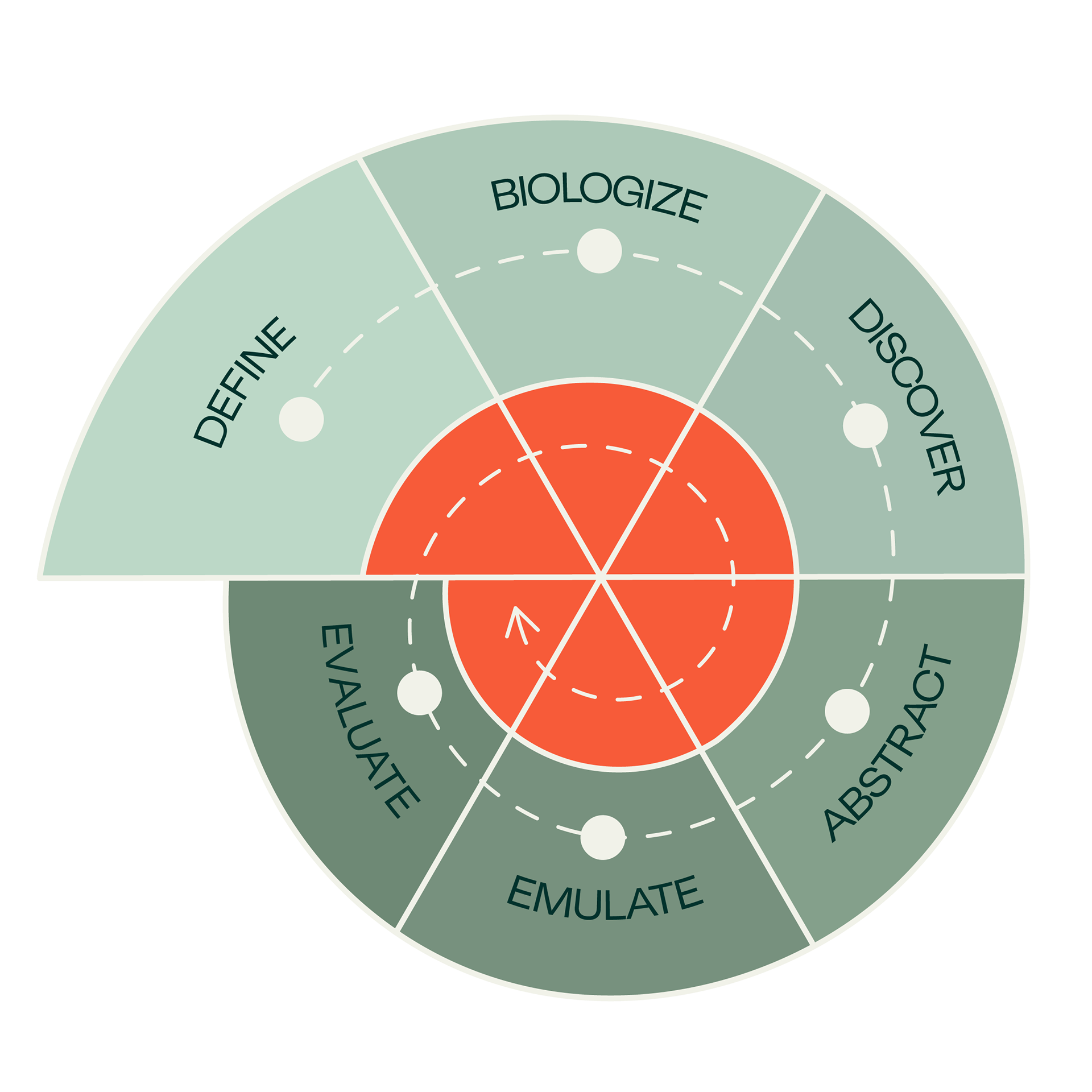 The spiral shape represents an iterative process that can be repeated as many times as needed. The spiral consists of:
