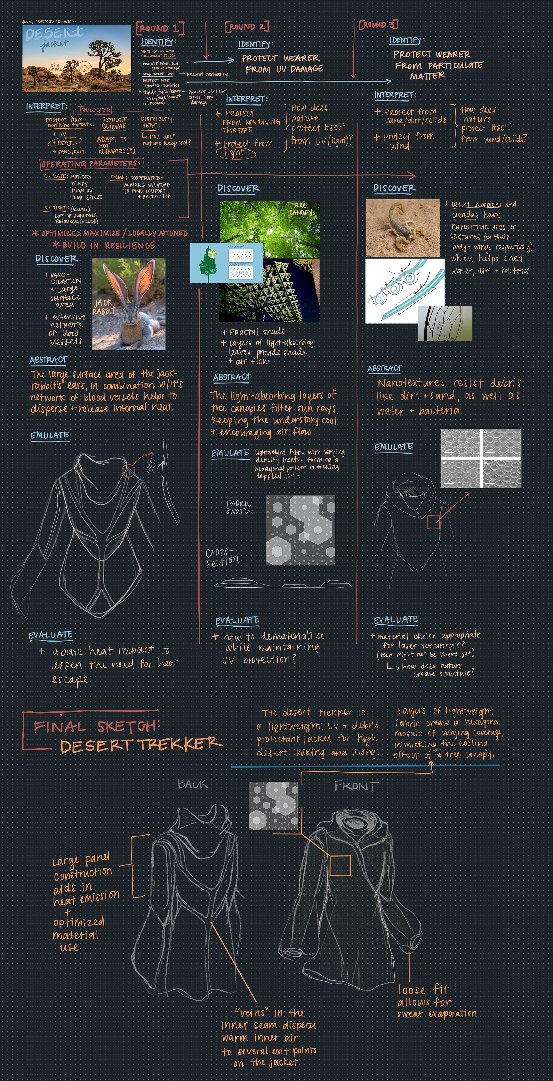Using biomimetic design processes and principles, I designed Desert Trekker, a jacket made for high-desert living. The jacket draws inspiration from the biological functions of common desert creatures, such as jackrabbits' large ears and the nanostructures on scorpion exoskeletons.